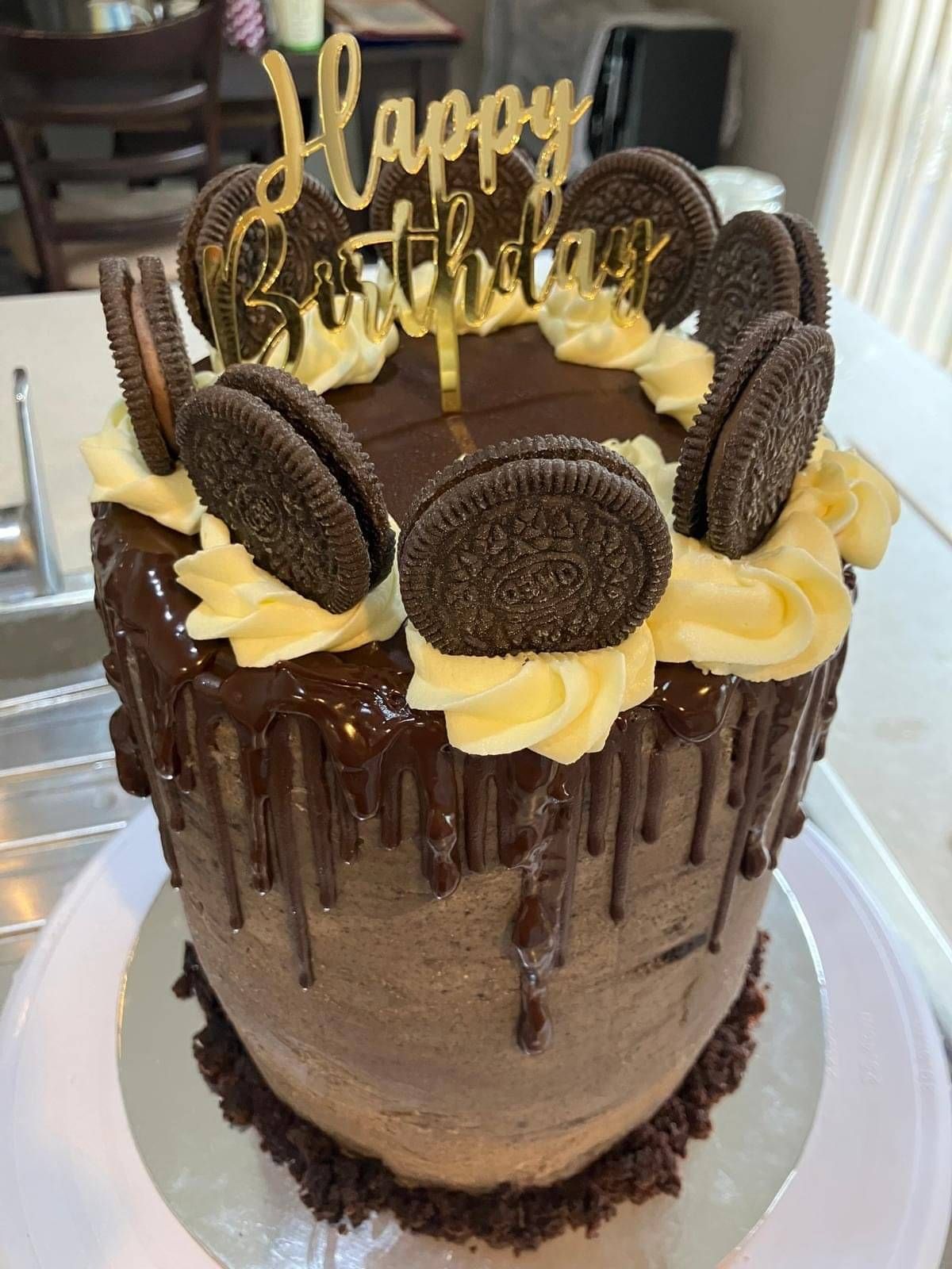 Four chocolate cake layers with chocolate ganache filling, Oreo buttercream, Chocolate drip, topped with Vanilla Buttercream and Oreos