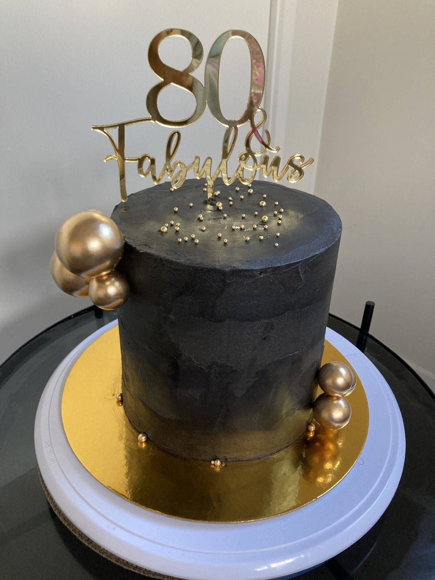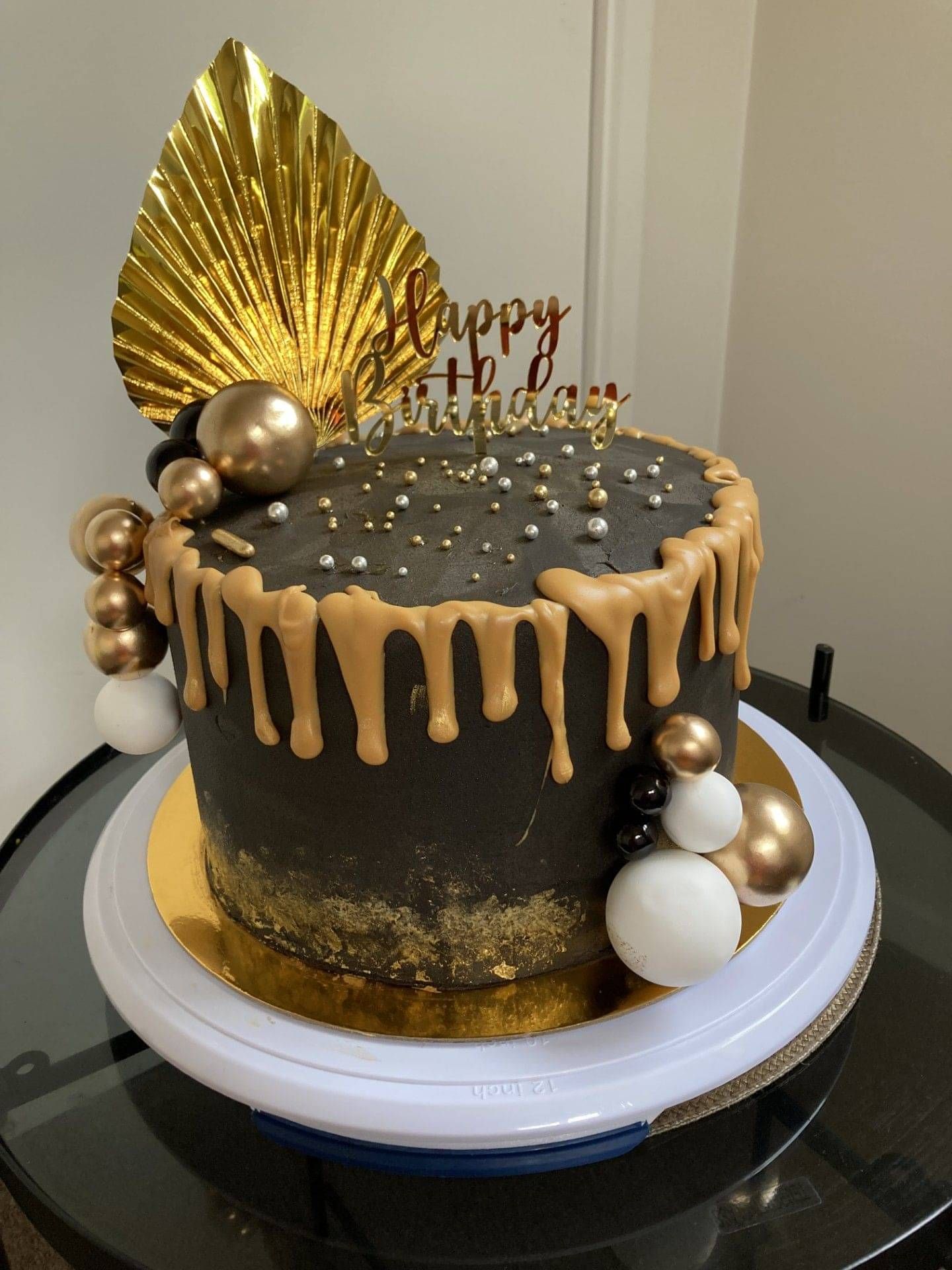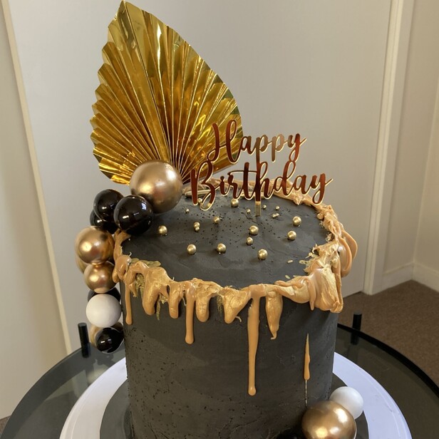 Lemon curd filling, 4 layers, 6", chocolate cream cheese buttercream, black and gold cake decoration