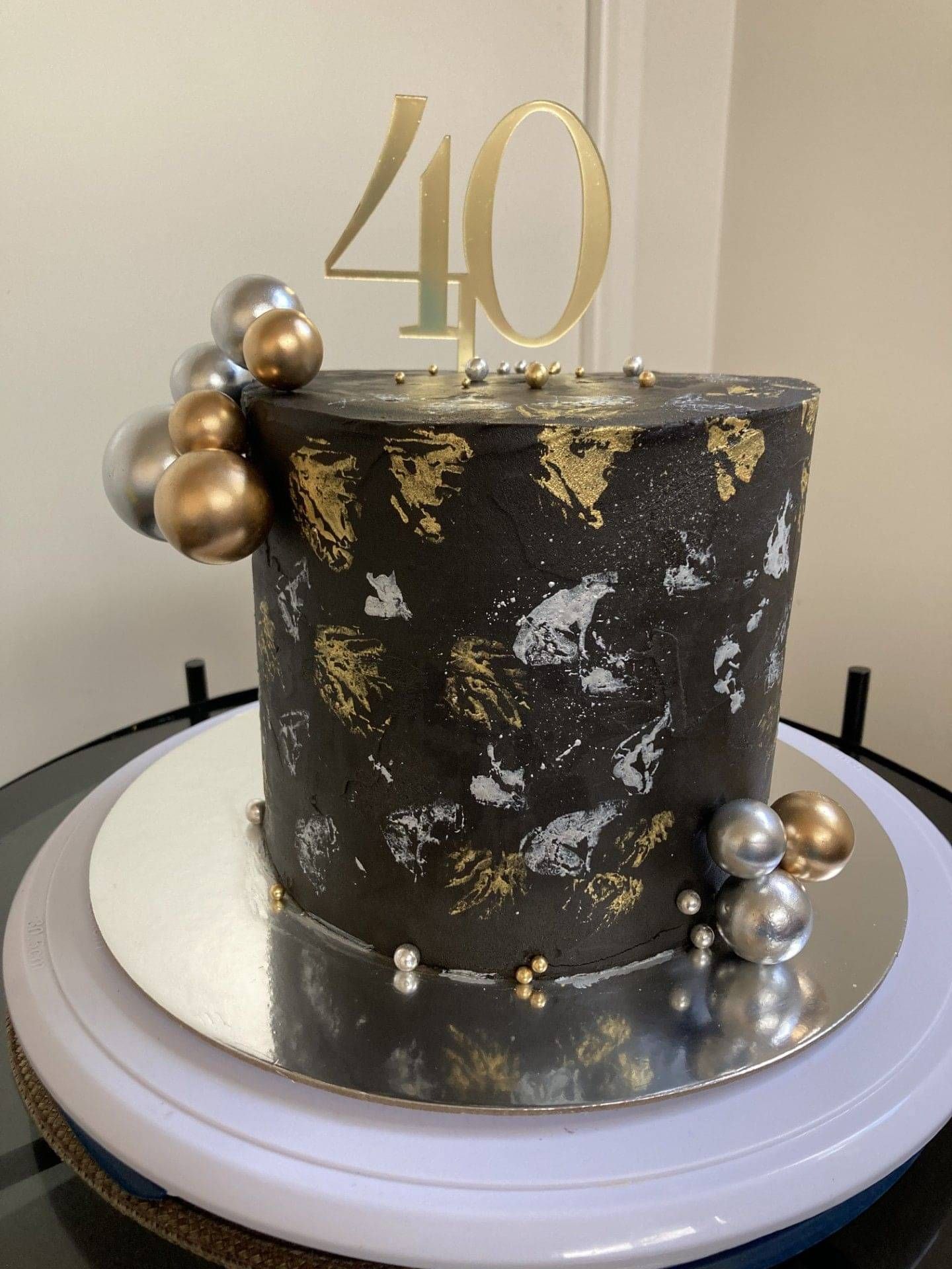 Chocolate ganache filling, 4 layers, 6", chocolate buttercream, black and gold and silver cake decoration