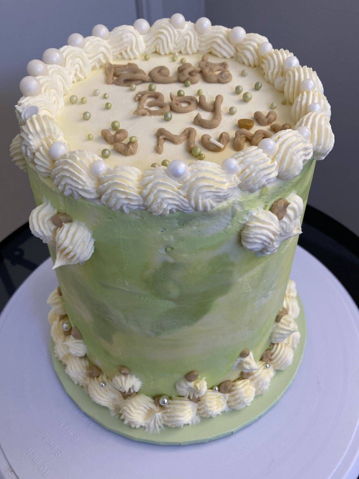 Four vanilla cake layers with lemon curd filling, Swiss Meringue buttercream, topped with Buttercream Swirls