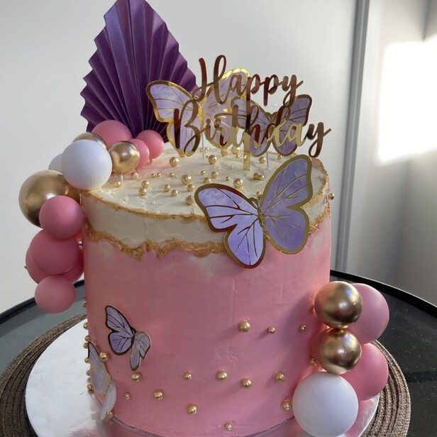 Chocolate cake, Chocolate ganache filling, Vanilla Buttercream, 4 layers, 6", Ball, butterfly, crown toppers, edible image
