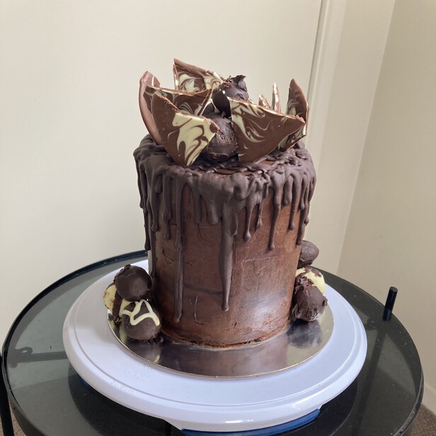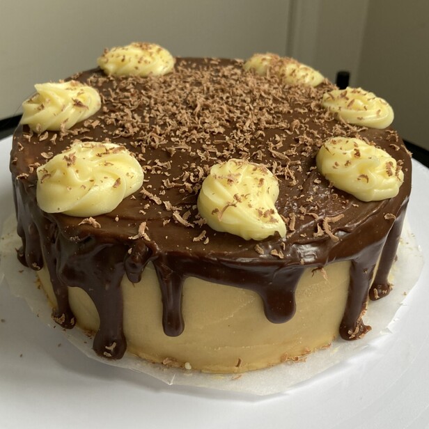 Chocolate cake, caramel filling, with Buttercream, chocolate ganache, 2 layers, serves 5-6 people