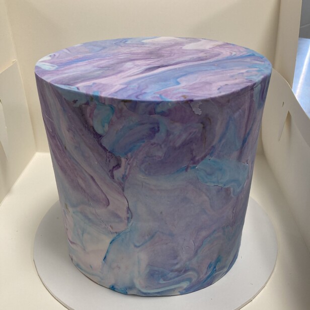 Four Vanilla cake layers with Vanilla buttercream & Raspberry Jam filling, White Chocolate ganache, topped with Fondant