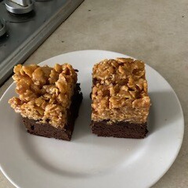 Peanut butter buttercream, caramel filling, chocolate Buttercream, 4 layers, 8", topped Peanut butter drip