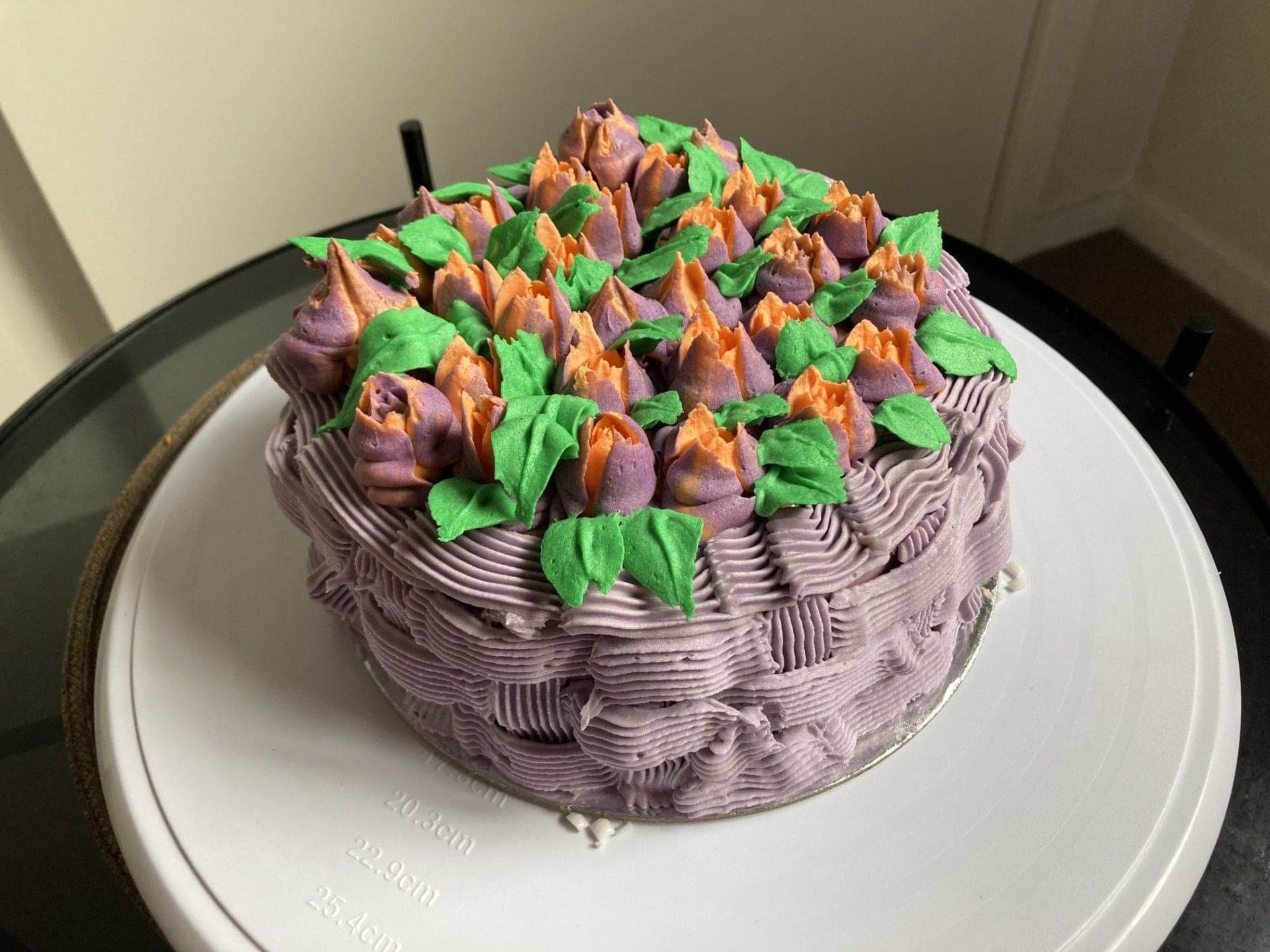 A classic three-layer Vanilla Cake with moist vanilla sponge, raspberry jam, and smooth vanilla buttercream. Available in 6-inch and 8-inch sizes, it suits any event. Customise with icing colours - turquoise, pink, yellow - or add a piped message for a personal touch.